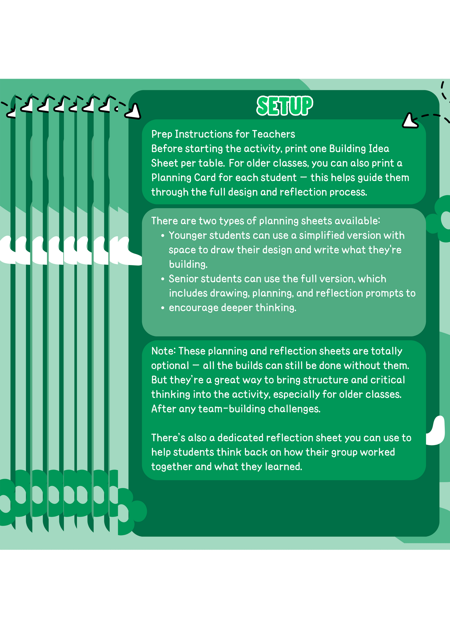 • Planning Card Worksheet: Helps students organize their ideas, sketch their designs, and reflect on their building process, highlighting what worked well and what challenges they overcame.